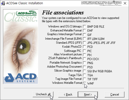 ACDSee 파일 연결 'File associations'에서는 연결 가능한 항목이 모두 '☑' 체크되어 있으며, 다른 이미지 뷰어 프로그램을 기본 앱으로 사용하는 경우에는 개별 확장자를 '□' 체크해제 하거나 좌측 하단의 'Uncheck all' 버튼을 눌러 모두 '□' 체크해제 하고 'Next > 버튼을 클릭합니다.