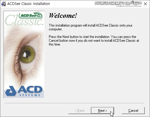 설치 마법사인 ACDSee Classic Installation 창이 활성화 되어 'Wellcome!' 메시지가 나타나면, 하단의 'Next >' 버튼을 클릭합니다.